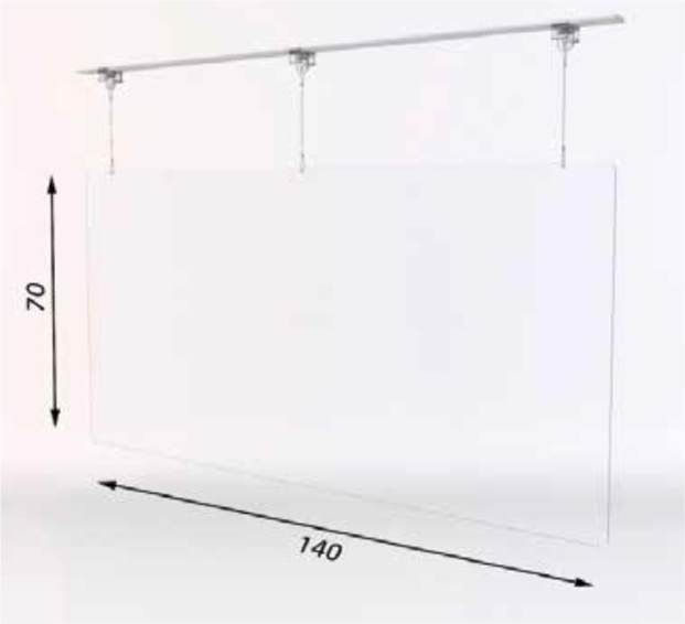 Schutzglas zur Abhängung von der Decke - Material farbloser Kunststoff, 5-6 mm stark - bietet klare Durchsicht - ist einfach zu reinigen und zu desinfizieren - inklusive Edelstahlseilabhängung, Länge 2,0 m - Ecken gerundet, Kanten gebrochen - Gewicht 80 x 100 cm = 5,9 kg