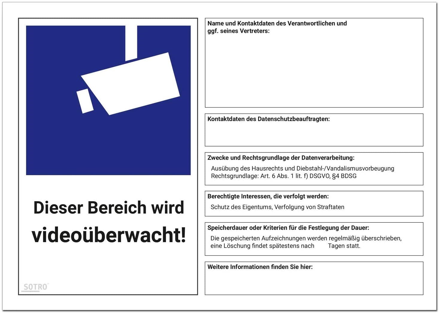 Aushang / Schild als AUFKLEBER Videoüberwachung nach DSGVO / BDSG - Video Symbol nach DIN 33450 100% MADE IN GERMANY: Aufkleber Folie mit UV-Schutzlaminat und ist somit auch OUTDOOR geeignet (kratzfest, vergilbungsfrei und witterungsbeständig). Die Abmessung beträgt je nach Wahl A4 (210 × 297 mm) oder A5 (210 x 148 mm) Freifelder zur Beschriftung mit einem Permanent Stift. Zur Anbringung an Fenster, Türen und anderen glatten Oberflächen geeignet. Bitte achten Sie bei der Beklebung darauf, dass der Untergrund staub - und fettfrei ist. TOP-QUALITÄT und hergestellt in Deutschland: Original von SOTRO. Perfekt zum anbringen auf glatten Oberflächen im Büro, Werkstatt, Gaststätte, Haus, Kindergarten, Schule, Garage etc. Artikelnummer 55055766