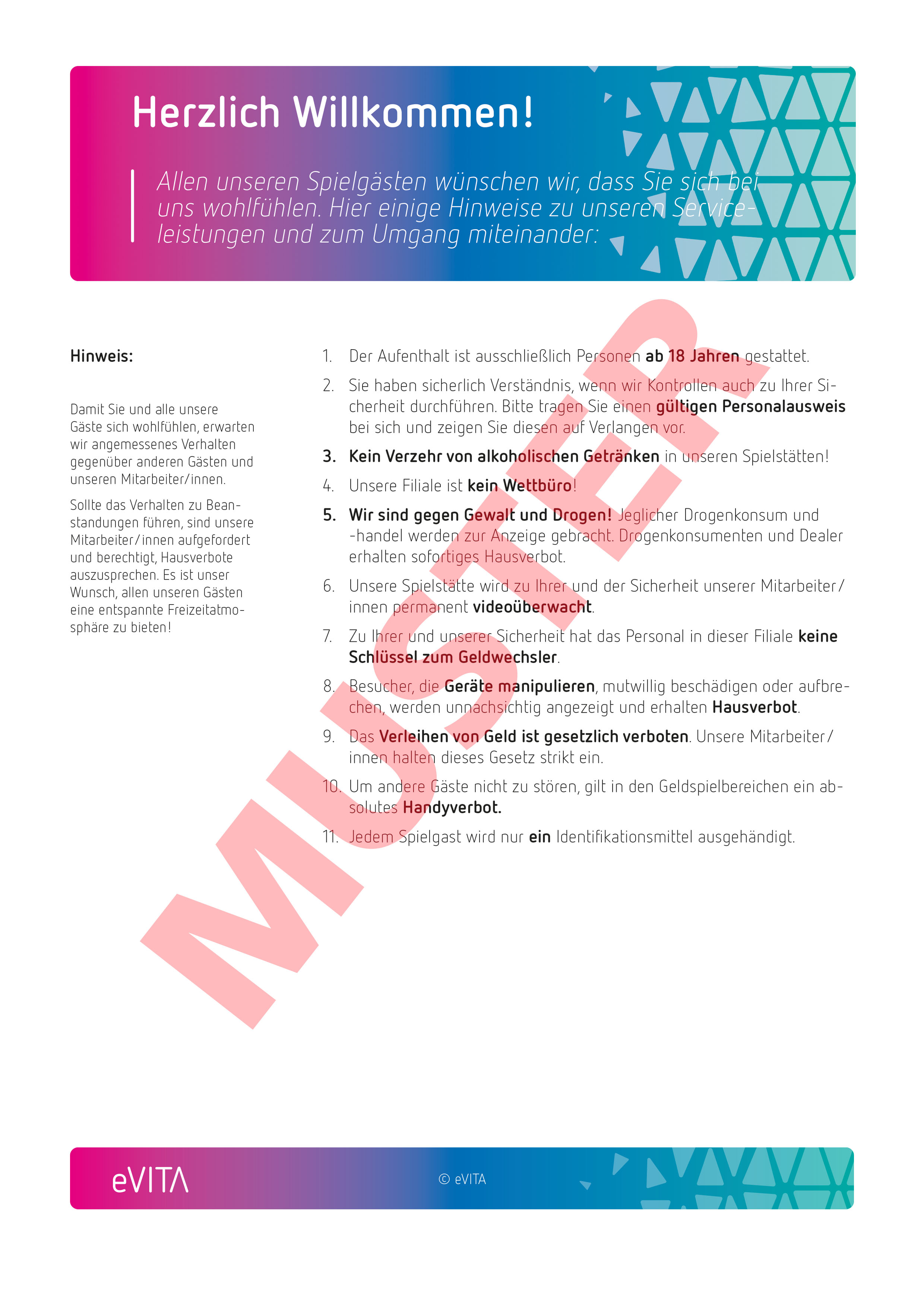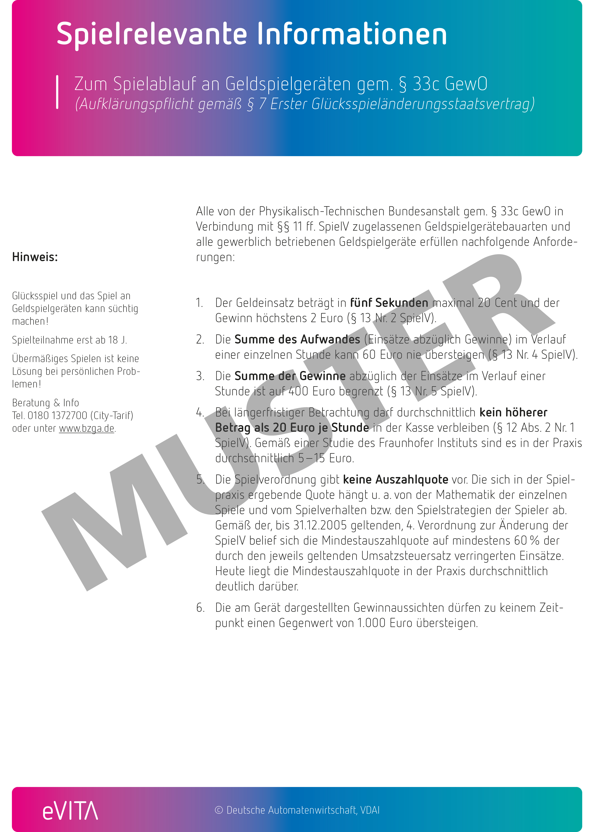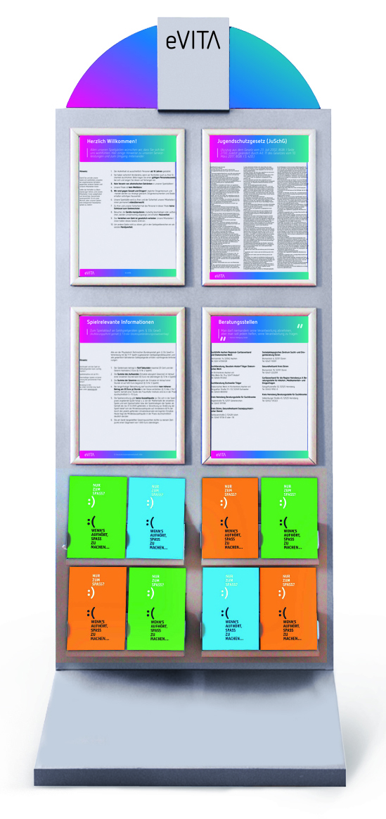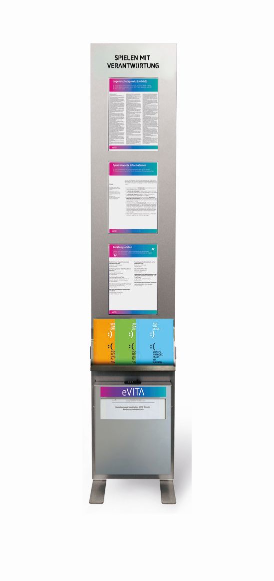 Schriftzug “Spielen mit Verantwortung” Plakate (JuSchG, Spielrelevante Informationen, Beratungsstellen) im eVITA-Design Ein Ablagefach universal für DIN lang, DIN A5 und/oder DIN A4 ein Ablagefach inkl Zahlenschloss für das Sozialkonzept Edelstahlfüße für höchste Stabilität Maße: B 333 mm x H 1750 mm # 55043564