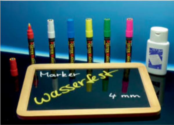 - Wasser- und wischfester Spezialmarker für die Beschriftung von Angebotsschildern, Plakaten, Spiegeln und Schaufensterscheiben - Set bestehend aus 6 Farben - erhältlich in 5 Schreibstärken -Gratiszubehör 100ml Reinigungsmittel "Loom Clean"
