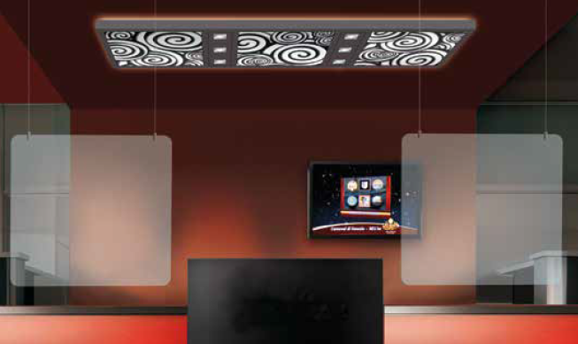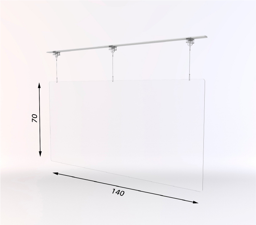 Schutzwände zum Abhängen - bei der hängenden Variante werden Befestigungsmaterialien für 2 verschiedenen Decken mitgeliefert - für einfache Decken zum bohren und auch Deckenklammern für abgehangene Decken - die Schiene auf dem Bild dient nur als Beispiel