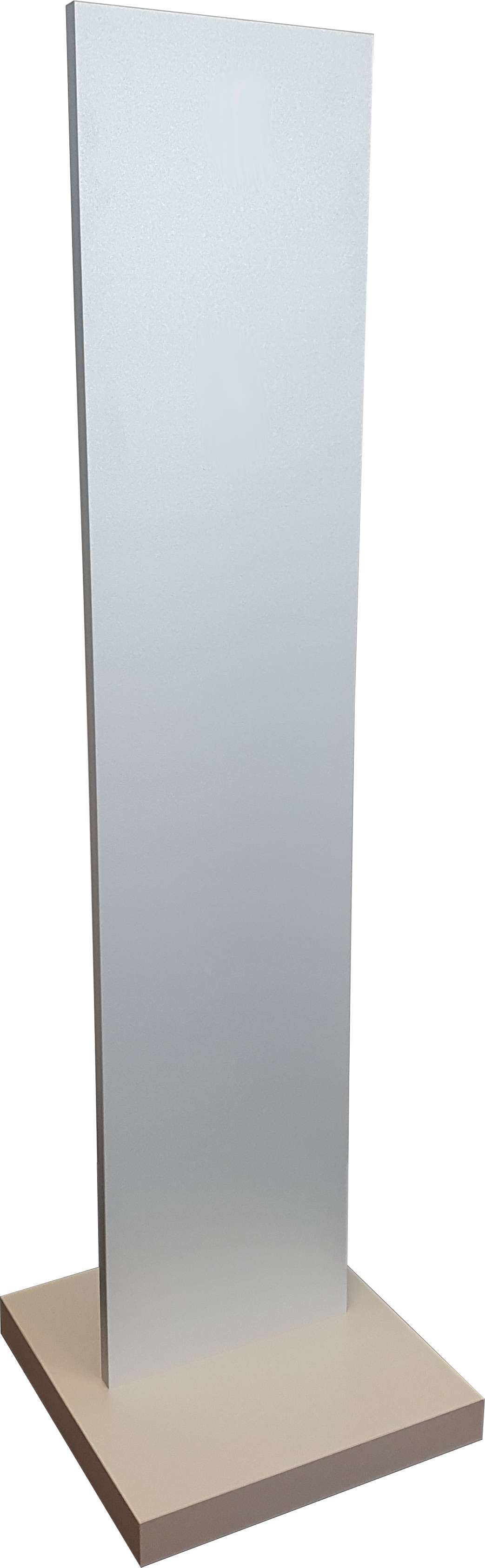 Motivformat DIN A1 (594x841 mm) Doppelseitig Klemmrahmen mit Antireflexfolie Standgestell mit Alu-Rundrohr mit Einschub Farbe: Silber eloxiert Fußplatte auf MDF mit Filzgleitern 450x22 mm Höhe ca. 1800 mm Gewicht 12 Kg
