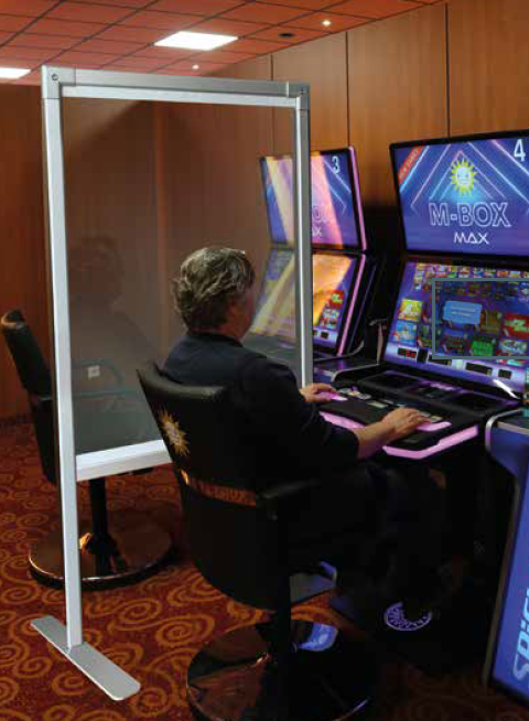 Hygieneschutzwand mit Vorhang - stabiler Standfuß mit Platte zur Platzierung unter Spielgerät - sicherer Stand - durchsichtiger Folien-Vorhang in B1 Qualität - jederzeit auf- und zuziehbar - Höhe ca. 212 cm, Tiefe ca. 178 cm
