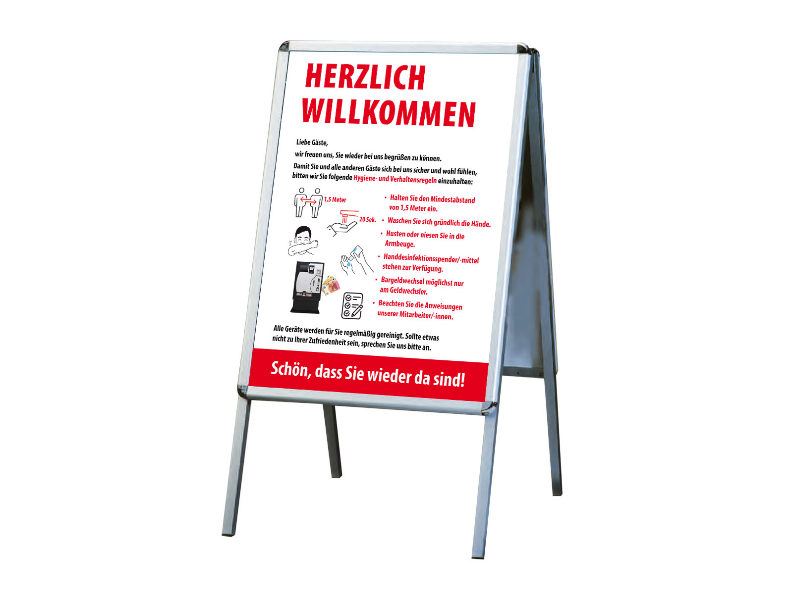 Kundenstopper CLASSIC (wetterfest) - hochwertige Aluminiumkonstruktion - abgerundete Ecken, chromglänzend - Wasserablaufstanzungen - Profil 32 mm - silberfarbig eloxiert EV 1 - Höhe 1.150 mm - Antireflex-Schutzfolien - Rückwand Stahl, verzinkt und beschichtet - schnelles Wechseln der Poster durch Klemmprofil - Plakatformat DIN A1 (594 x 841 mm) -ohne Inhalt (hier Plakat "Herzlich Willkommen! bitte separat bestellen)